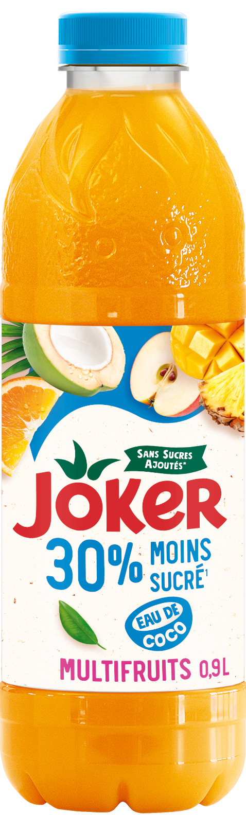 Joker 30% Moins sucré Comme tous les jus de fruits, ce jus est sans sucres ajoutés*, sans colorants*, ni conservateurs*. En plus grâce à l'eau de coco, il est 30% moins sucré (1) et sources de vitamines C et B9. Le parfait équilibre pour se faire plaisir tout en se faisant du bien! Composé d'oranges issus de cultures plus durables (2).