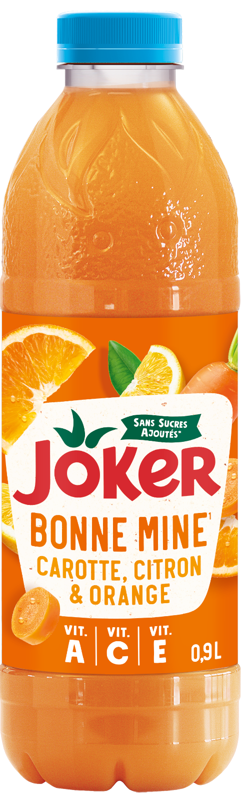 Joker Bénéfices Un délicieux mélange à base de carottes, citrons et oranges, sans sucres ajoutés* et sans conservateurs (2). Pour se faire plaisir au quotidien ! (1) La vitamine A contribue au maintien d'une peau normale Nos carottes, citrons et oranges sont issus de cultures plus durables (2).