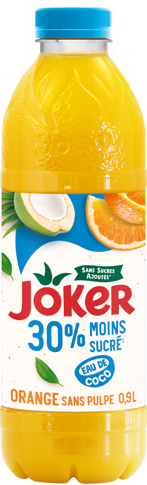 Joker 30% Moins sucré Comme tous les jus de fruits, ce jus est sans sucres ajoutés*, sans colorants*, ni conservateurs*. En plus grâce à l'eau de coco, il est 30% moins sucré (1) et sources de vitamines C et B9. Le parfait équilibre pour se faire plaisir tout en se faisant du bien! Composé d'oranges issus de cultures plus durables (2).