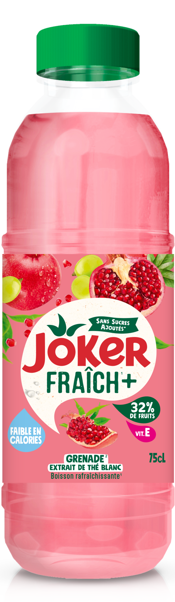 Joker Fraîch + Une boisson rafraîchissante et désaltérante avec une teneur en fruits de 32%, sans sucres ajoutés* et sans conservateurs. Un goût délicieusement fruité de raisin et de grenade allié à une saveur de thé blanc pour une sensation de fraîcheur. Et le petit +, de la vitamine E qui contribue à protéger les cellules contre le stress oxydatif!