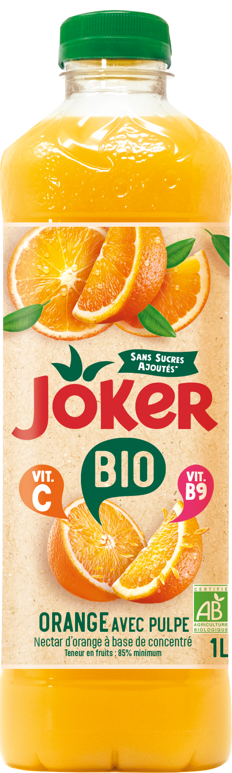 Joker Bio Un jus 100% BIO et responsable qui limite strictement l'usage des pesticides pour préserver la biodiversité. Garanti sans sucres ajoutés* (simplement le sucre naturellement présent), sans colorants (1) et sans conservateurs (1). Fabriqué en France à Mâcon pour vous accompagner au quotidien. Composé d'oranges provenant du Brésil, Mexique, Italie.. dans les conditions climatiques adaptées et issues de l'Agriculture Biologique.