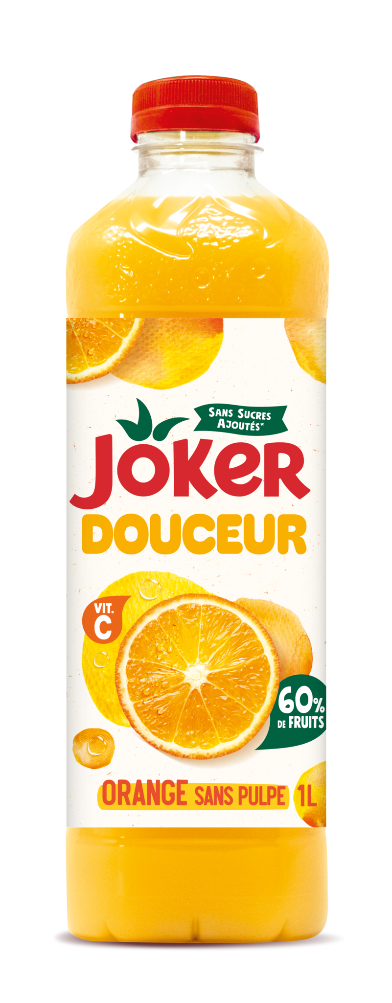 Joker Douceur Le plaisir de l'orange avec une teneur en fruits de 60%, sans sucres ajoutés* (simplement le sucre naturellement présent dans les fruits) et enrichi en vitamine C.