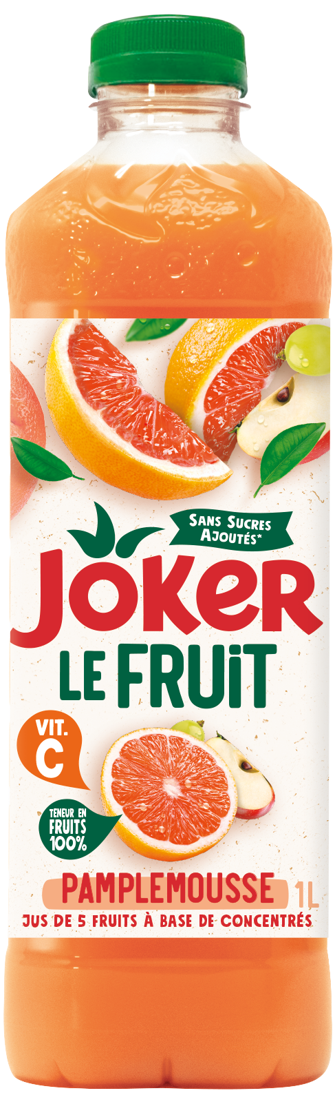 Joker Le Fruit Le plaisir d'un jus avec une teneur en fruits de 100%, sans sucres ajoutés* (simplement le sucre naturellement présent dans les fruits), sans colorants* et sans conservateurs*. Fabriqué en France à Mâcon pour vous accompagner au quotidien. Nos fruits proviennent des 4 coins du monde pour mûrir dans des conditions climatiques adaptées. Nos pamplemousses, pommes et raisins sont issus de cultures plus durables (1).