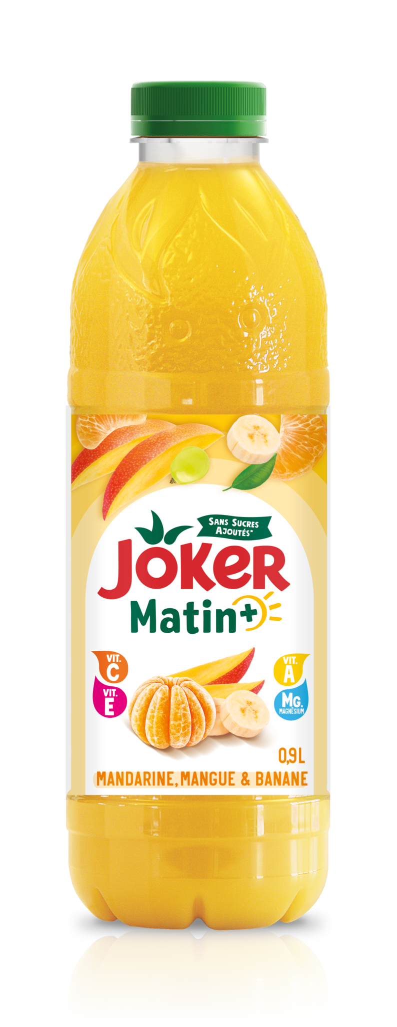 Joker Matin + Une recette aux associations de fruits inédites qui vous aide à bien démarrer la journée. Le peps de la mandarine allié à l'exotisme de la mangue et de la banane pour un goût doux et velouté. Et le petit +, une boisson enrichie en vitamines C, E, D, A et en magnésium. Le magnésium contribue au fonctionnement normal du système nerveux et à réduire la fatigue. Sans sucres ajoutés*