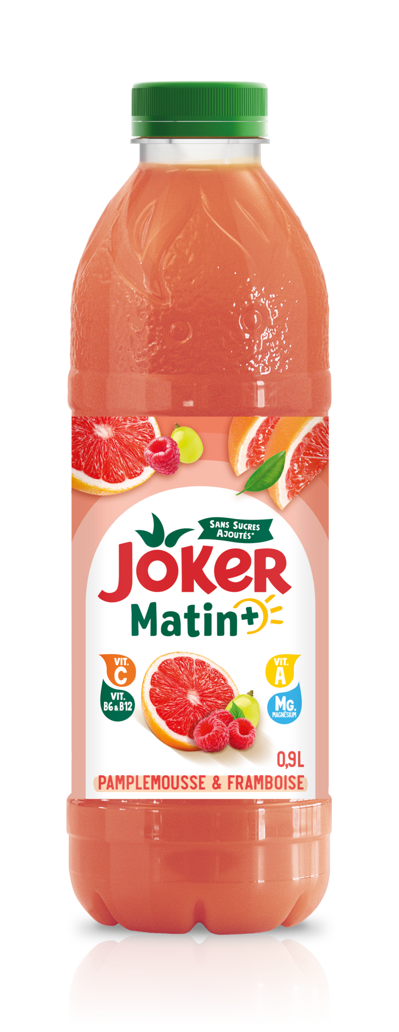 Joker Matin + Une recette aux associations de fruits inédites qui vous aide à bien démarrer la journée. Le peps du pamplemousse allié à la framboise pour un goût acidulé et équilibré. Et le petit +, une boisson enrichie en vitamines C, A, B6, B12 et en magnésium. Le magnésium contribue au fonctionnement normal du système nerveux et à réduire la fatigue. Sans sucres ajoutés*
