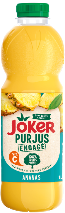 Joker Pur Jus Engagé Le plaisir d'un jus avec 100% d'ananas pressés. Fabriqué en France à Mâcon, sans sucres ajoutés* et sans conservateurs*. Nos ananas sont iussus de cultures plus durables(2) et proviennent des endroits du monde(3) adaptés à leur culture. (3) UE et non-UE.